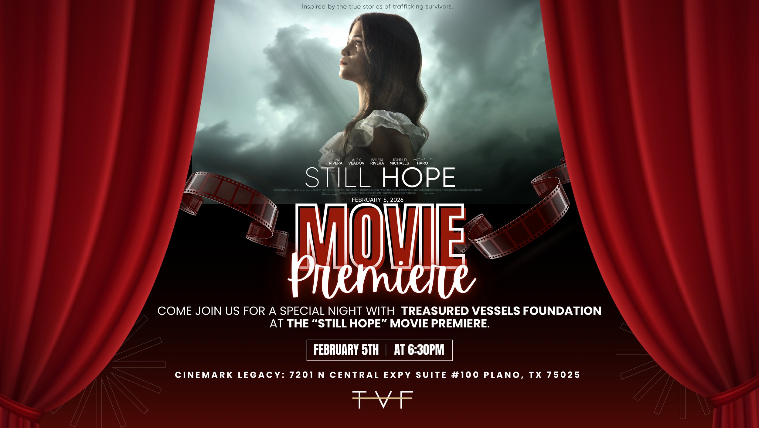 Join TVF for a private red carpet premiere of Still Hope, a powerful film exposing the reality of human trafficking and the difficult journey of healing afterward.
